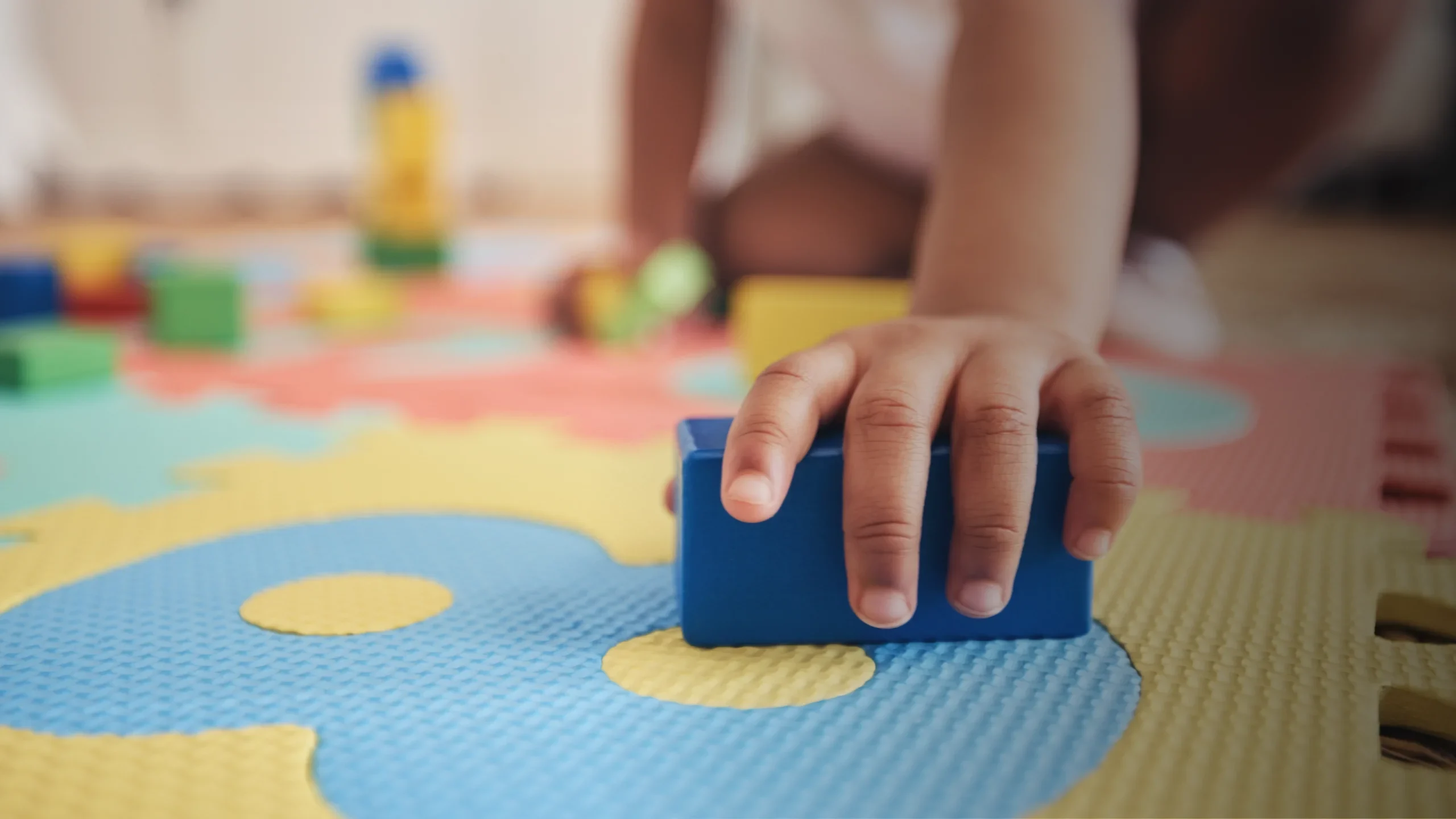 Children playing with toys on colourful mat.
